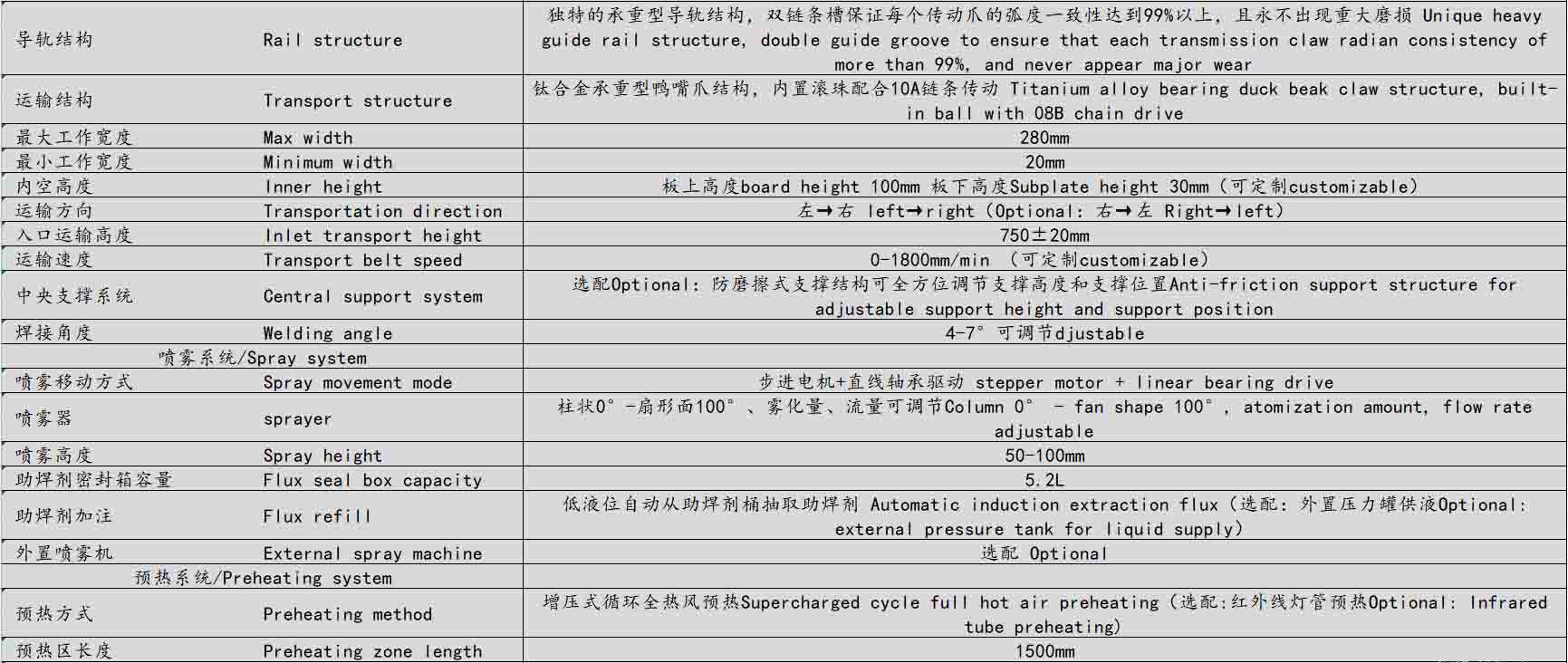 ● 獨特的承重型導軌結構,滾珠鏈條配合上下雙導槽保證每個傳動爪的弧度一致性達到99%以上,可滿足高要求、重型產品、治具的過爐要求,運輸時元器件無抖動,可承重100KG不變形不磨損