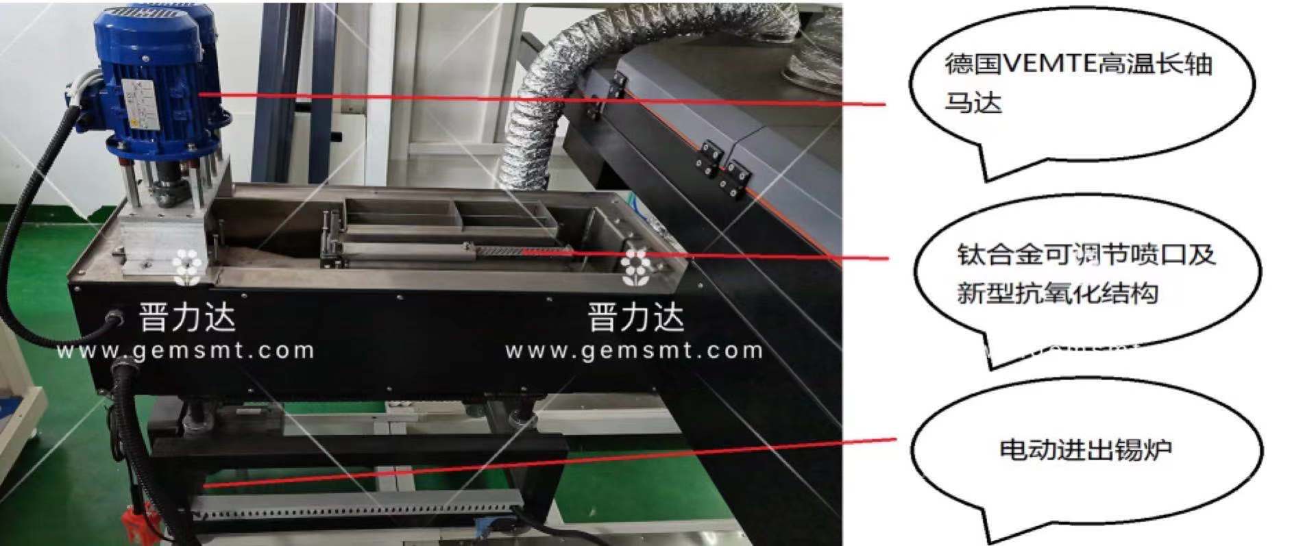 1、自動導流槽配合噴口前后緩沖裝置,大大減少錫渣氧化量,波峰跨度外部手動調節方便又安全。