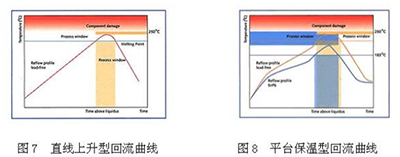 焊膏常用的爐溫曲線分為直線上升型(或三角型,如圖 7 所示)與平臺(tái)保溫型(如圖 8 所示)